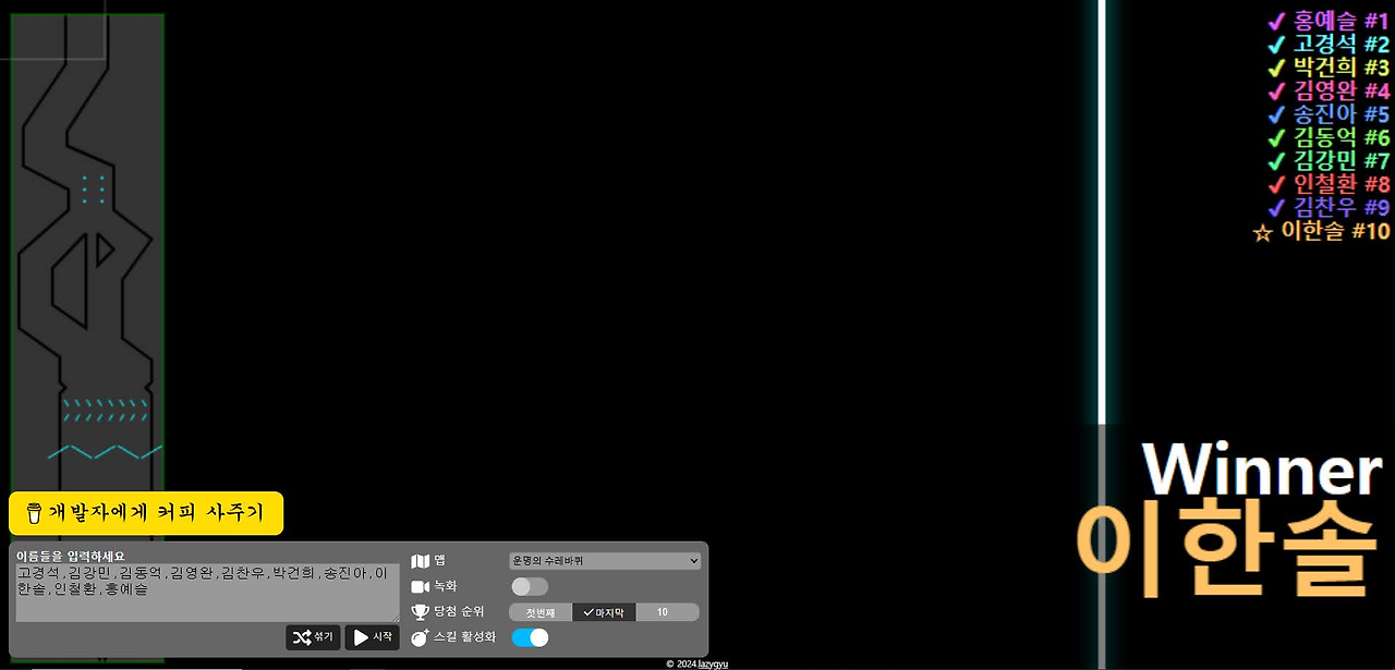 오늘은 특별히 1등이 아닌 마지막에 떨어지는 사람이 당첨으로 하자! 라고 하셔서 결과를 봤더니,