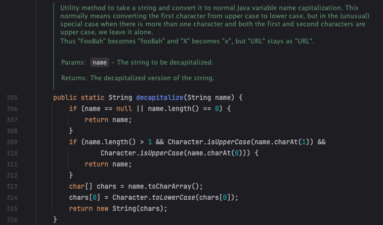 기존에는 Introspector.decapitalize() 메서드를 사용했다고 하는데, 불완전해서 deprecated되었고 현재는 StringUtils를 사용하고 있다고 한다.